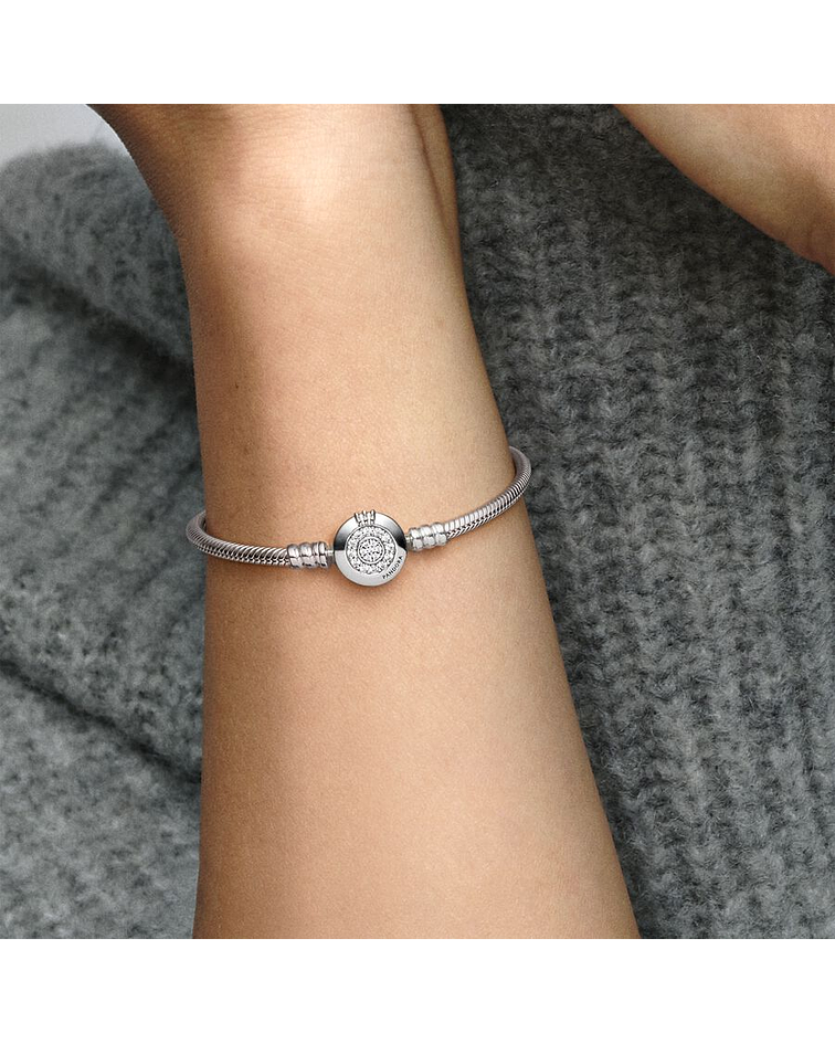 Da un toque de brillos a cualquier de tus outfit con la Pulsera Cadena de Serpiente Corona Brillante de Moments. Acabada a mano en plata de primera ley, el cierre de la pulsera presenta el icónico monograma de la O coronada de Pando y dos círculos de circonitas brillantes cúbicas transparentes en pavé. Otro elemento icónico de diseño de Pando, la cadena de serpiente, aportará un toque elegante y moderno a tu muñeca. Combínala con otras pulseras y embellécela con tus charms favoritos, para ponértela una y otra vez.