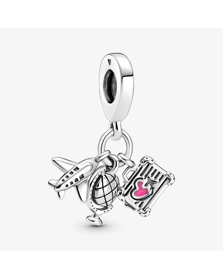 Es hora de hacer las maletas y agregar a tu colección el Charm Colgante Avión, Globo y Maleta. 3 charms en 1, esta joya en plata de primera ley es el sueño de cualquier amante de los viajes. Entre los detalles se incluyen ventanas ranuradas en el avión, líneas de latitud y longitud en el globo terráqueo y un corazón esmaltado a mano en color rosa en la maleta. Agrega este charm a tu colección de viajes como una promesa para planificar futuras aventuras o regálaselo a tu mejor amiga trotamundos.