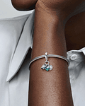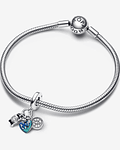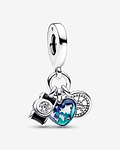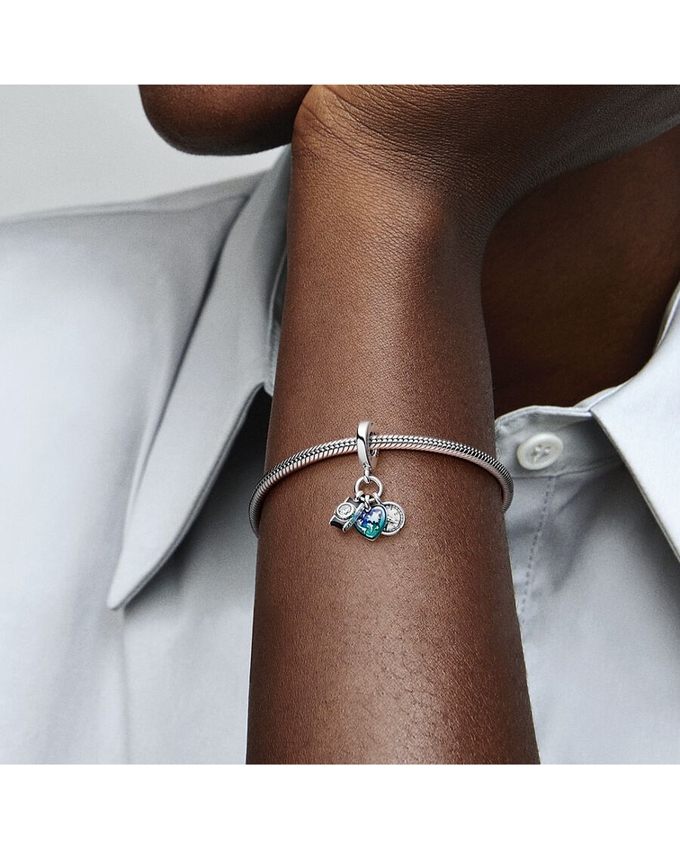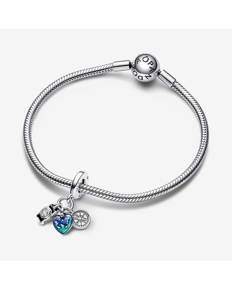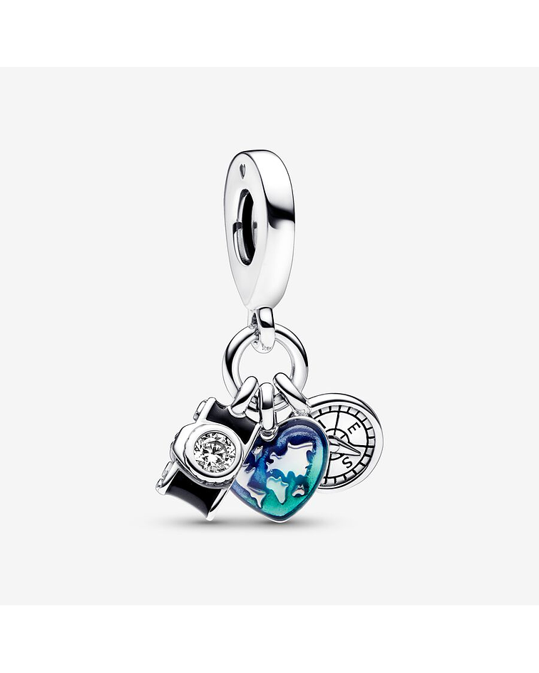 Un charm para los que les gusta soñar y explorar. Usa el Charm Colgante Triple Cámara, Corazón y Brújula para llevar en tus joyas tus recuerdos de viaje favoritos. Este colgante triple en plata de primera ley se presenta con una cámara decorada con una brillante gema como lente, un mapa del mundo con forma de corazón embellecido con esmalte en color azul y verde degradé y una brújula con la aguja fija. Los reversos de los colgantes se han decorado con las inscripciones "Discover", "Dream" y "Explore" (Descubrir, Sonar y Explorar). Combínalos con tus charms favoritos de tus viajes como recordatorio de que siempre debes seguir explorando.