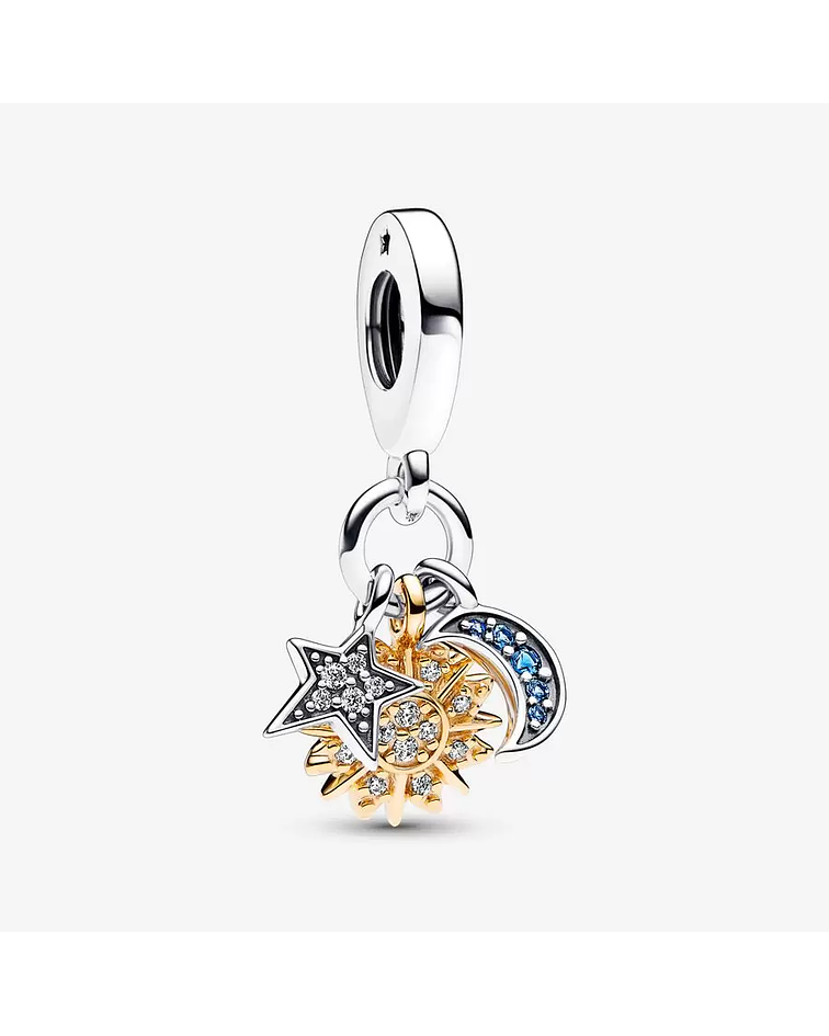 Da un toque de brillante magia celestial a tus joyas con el Charm Colgante Triple Celestial en Dos Tonos. Este charm combina tres iconos celestiales: el motivo de un sol con baño de oro de 14k, gemas brillantes y microesferas, una estrella en plata de primera ley embellecida con pavé de gemas transparentes y una luna creciente en plata de primera ley decorada con piedras de color azul profundo. Llévalo como símbolo de equilibrio y armonía, en la danza cósmica del universo y dentro de nosotros mismos.